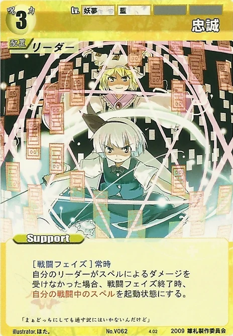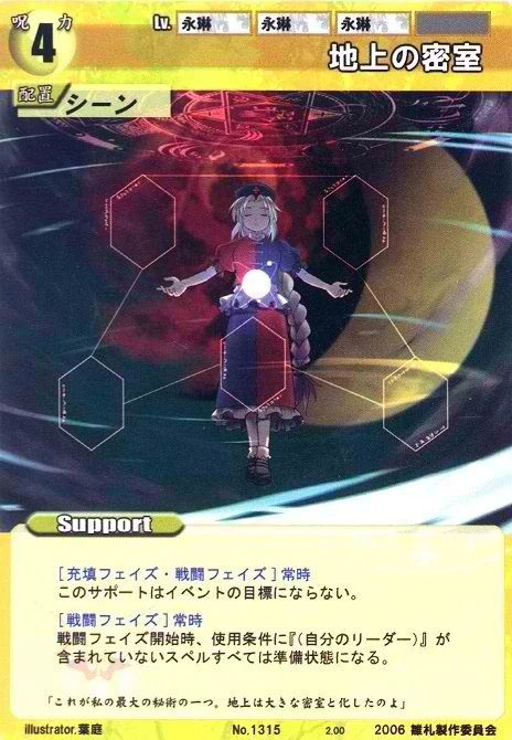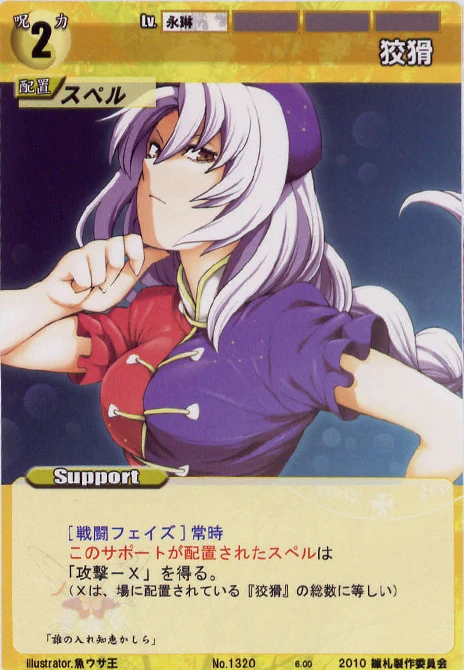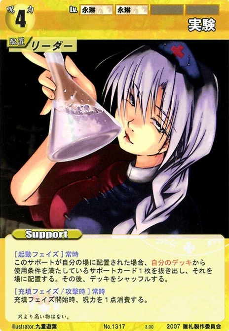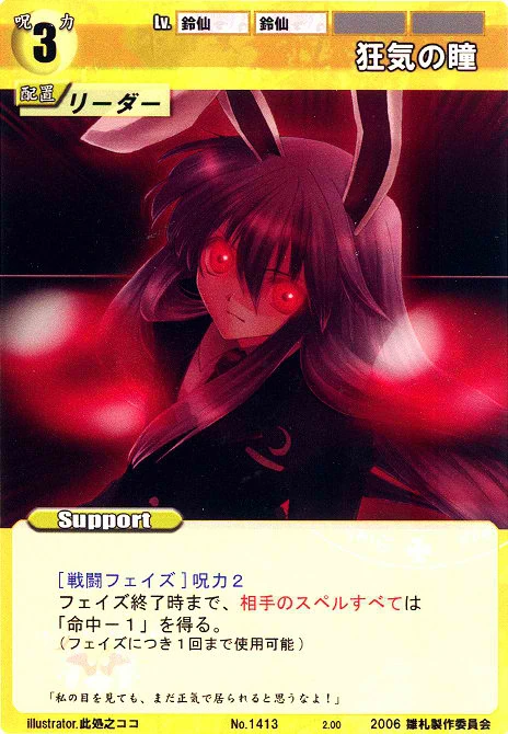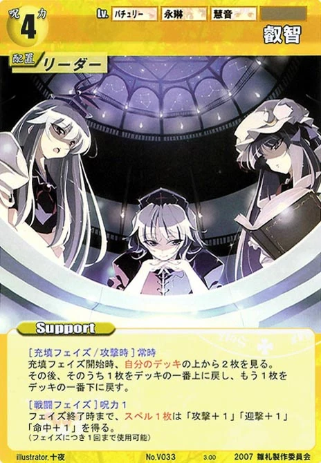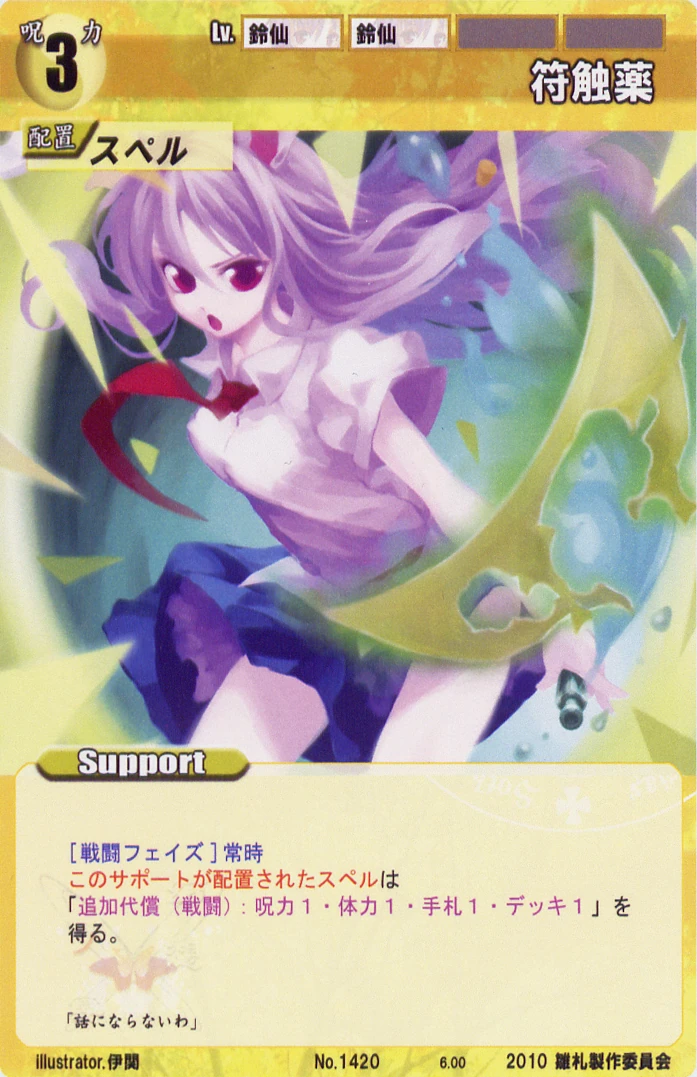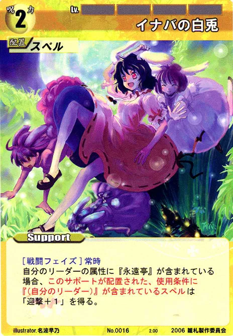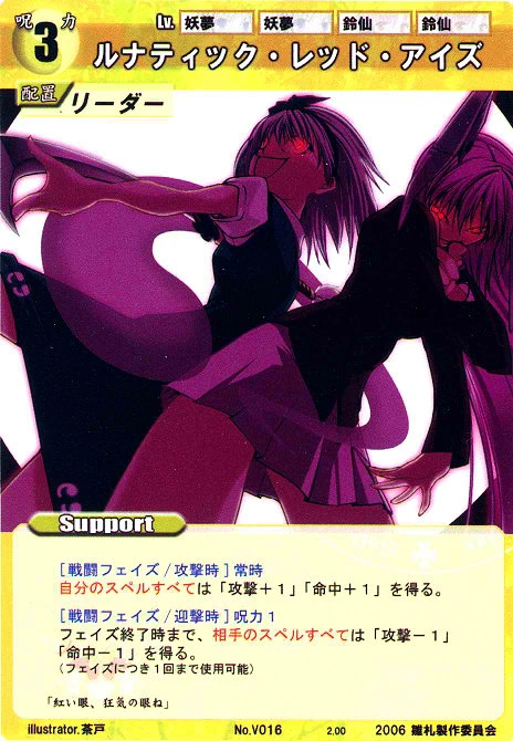 - Special: [Battle Phase] If your Leader has the "Eientei" Designation, the Spell equipped with this Support gains +1 IV if that Spell requires your Leader.