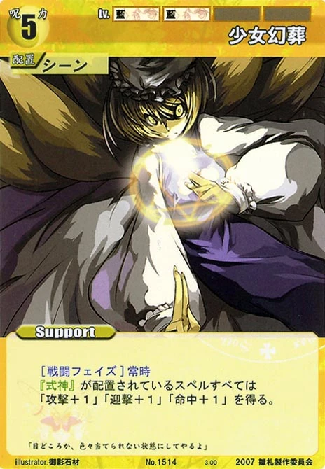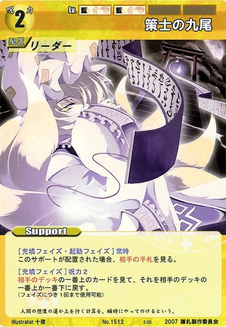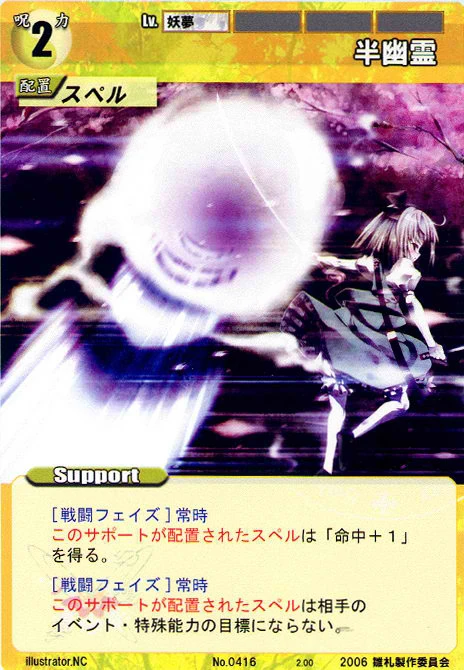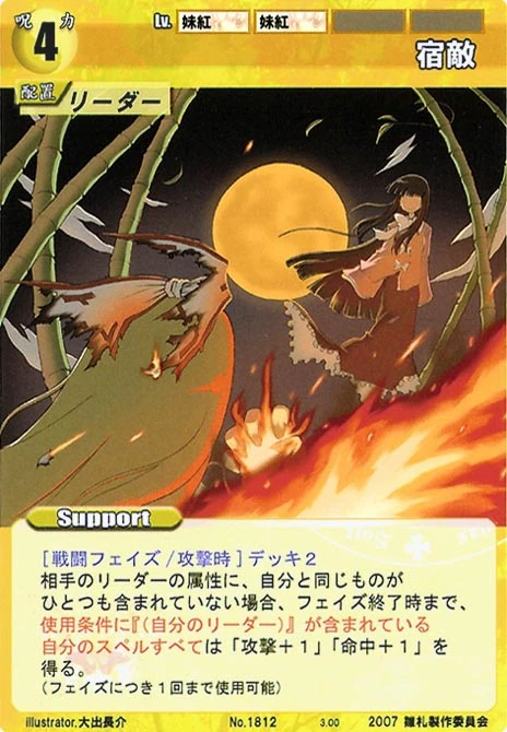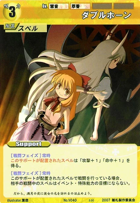 - Special: [Battle Phase] SP 1 If your opponent's Leader has the "Youkai" Designation, then until the end of the phase, one of your Spell Cards gains +1 HV. (This effect can only be used once per phase.)