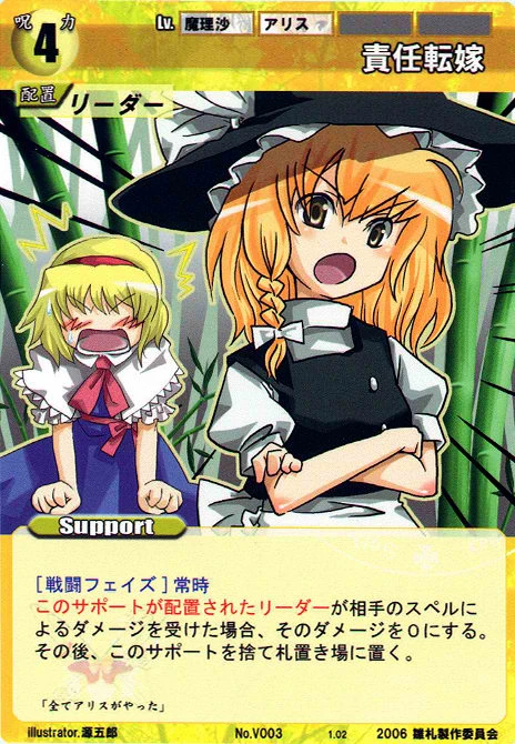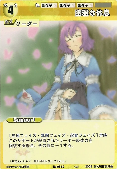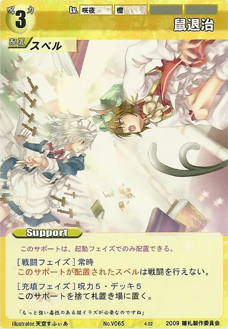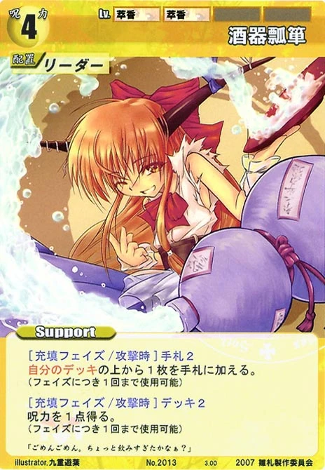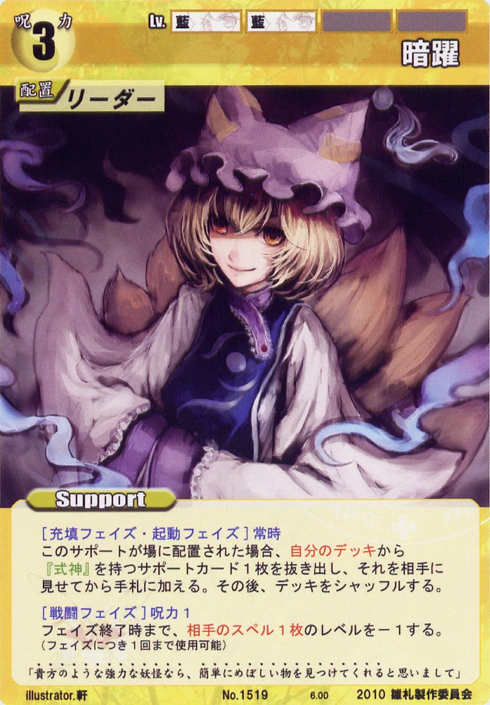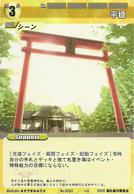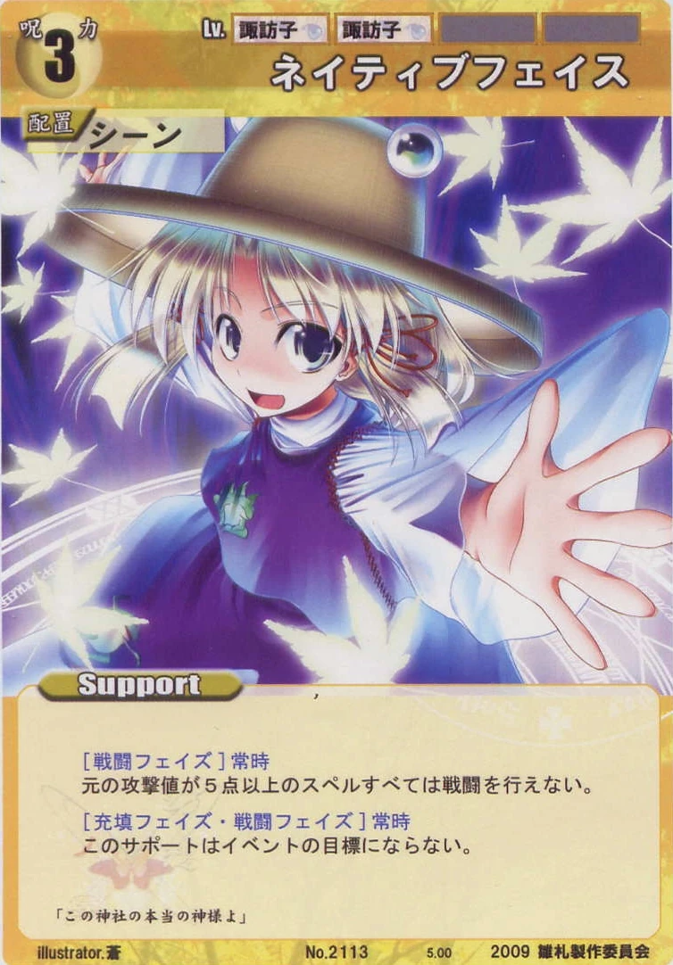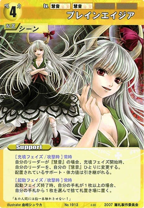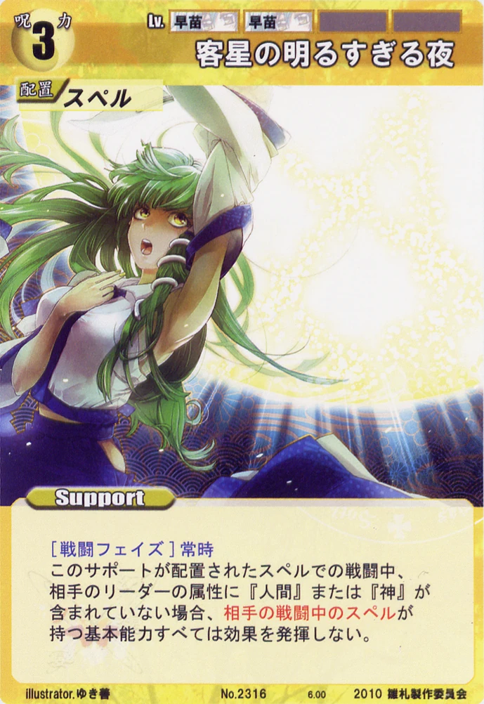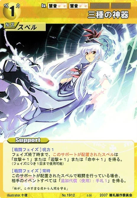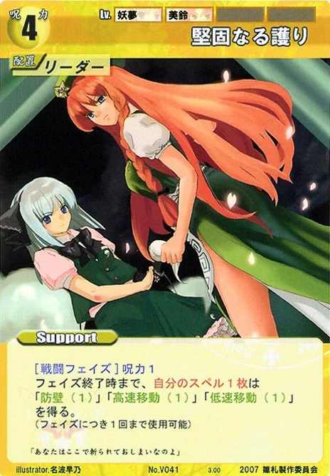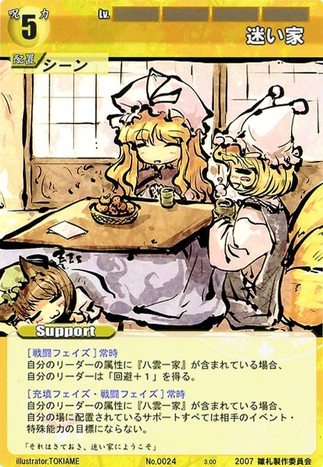 - Special 2: [Replenishing or Battle Phase] If your Leader has Yakumo Family in her Designation, all of your equipped Supports in your field cannot be the target of your opponent's Events or Specials.