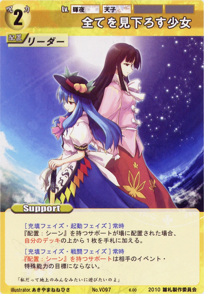 - Special: [Battle Phase] While your Leader has the "Youkai Mountain" designation, all of your Spells that require your Leader gain +2 HV.