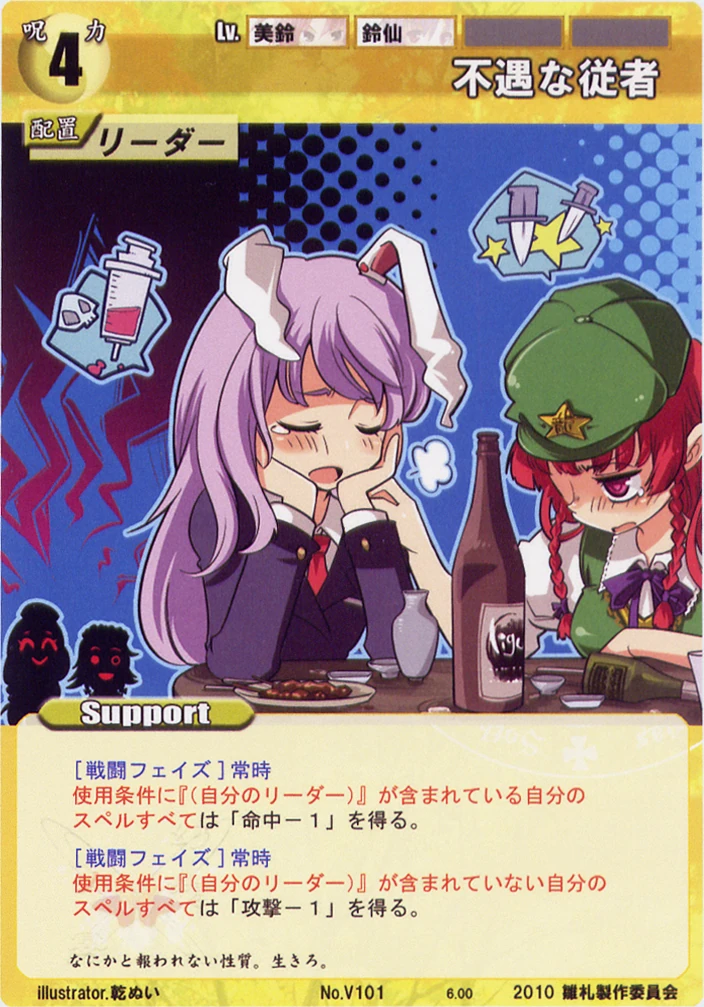 - Special: [Battle Phase] If your Leader has the "Eientei" Designation, the Spell equipped with this Support gains +1 IV if that Spell requires your Leader.