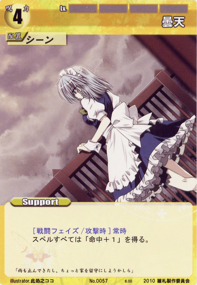 - Special: [Battle Phase] If your Leader has the "Scarlet Devil Mansion" Designation, the Spell equipped with this Support gains +1 AV if that Spell requires your Leader.