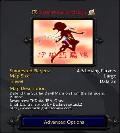 Scarlet Devil Mansion Defence, or SDMD for short, is a hero-defense map for Warcraft III based on the Touhou series of games. Up to 5 players control one of the heroines from the Touhou series to defend the Scarlet Devil Mansion from waves of attacking creeps, and players can choose to attack several super-powerful bosses on the map for additional experience and gold.