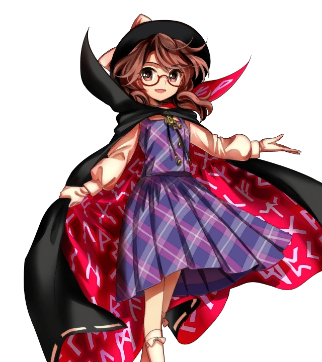 She has brown eyes and shoulder-length brown hair. Wears a black hat with a white bow on her head, also wears red-framed glasses. Her dress may be a school uniform, consisting of a pink + purple plaid dress, over a long-sleeved blouse. Over her dress she has a black, high-collared cape with a red interior inscribed with runes. On her feet she wears white socks with bows, and black shoes. She also carries a tablet computer with a pentagram drawn on the back and zener cards