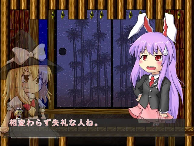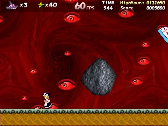 Note that the first set of stars in this stage form eyes staring out at you. In the second part of this stage, you will notice more stars that form a bullet shape, and that the pipe leading to the boss battle and the floor area surrounding it form an ass shape, thereby giving away who the boss is. Poor Reisen just can't get away from the suppository jokes.