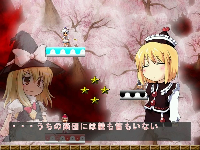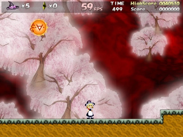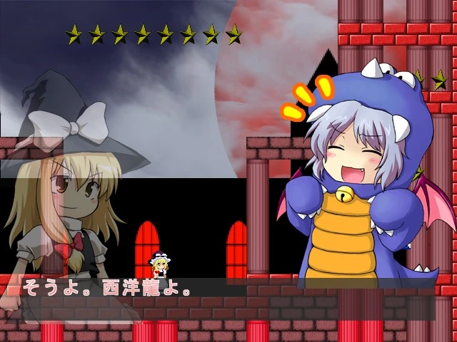 This battle is actually relatively straightforward. At the beginning of the level, the sun will stay harmlessly where it is. Once you have progressed enough, it will start circling in place, then dive down in an arc across the screen to the other top corner in a similar fashion to the Cirno battle except the sun will aim for where you are on screen when it starts its swoop. Note that the sun's arc is dictated by the screen and NOT the stage, so you cannot deke it horizontally. Not long after it comes to life, you will come across many P blocks, all of which contain white fuzzies. When you are not dodging a swoop, stomp on a fuzzy and pick it up. Hold it while facing the sun and wait for it to swoop into you. It will hit the fuzzy and both will go crashing off the screen, with the sun respawning a few seconds later. 5 such collisions will finish the sun off for good, thereby ending the level (I bet you were wondering why you couldn't find Koakuma, huh?). Overall, this is probably the easiest battle in the game - the major challenge in this stage is collecting all the stars (you will have to go all the way back to the beginning and drill jump off the sun to get over the huge pit that you started the level right next to).