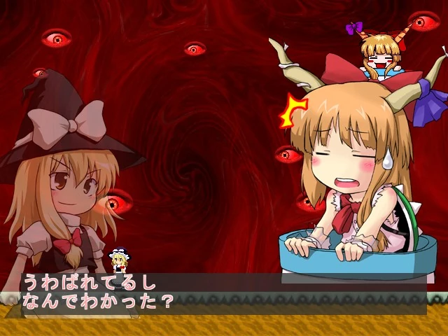 At this point, if you're good enough, you can cheese your way through the battle by keeping Suika down on the ground with drill kicks. If you can time your jumps well enough that you prevent her from taking to the air again the fight becomes trivial, but it's not easy to do.