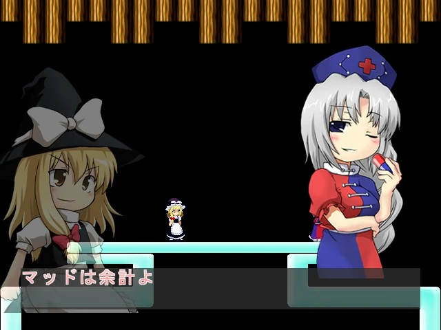 The battle begins with you and Eirin on top of a giant glass jar. She will break the seal and you will fall down to the bottom, at which point she starts throwing pills at you which descend slowly and in a straight line down. Like in Dr. Mario, each pill has two sides, and each side will be one of red, yellow or blue. When a pill gets to the bottom of the jar, it will turn into two fuzzies which are colored based on the color of the pill. These cannot be destroyed and they amass pretty quickly, so don't fall down. Work your way up through the jar, using the pills as platforms, until you can get out. (Be careful when standing on pills, as they slowly turn into fuzzies under your feet if you take too long to get airborne again.) Jump on Eirin just once to knock her into the jar and finish the battle. Note that drill kicking a pill will do different things depending on the color of the side you hit. Drill kicking a yellow side is like drill kicking an enemy (and thus allows for super jumps), drill kicking a blue side will move the whole pill over one half-pill length in the direction the blue half is pointing, and drill kicking a red half will freeze the pill in midair for a few seconds (it is safe to stand on this frozen pill without worrying about it turning into fuzzies).