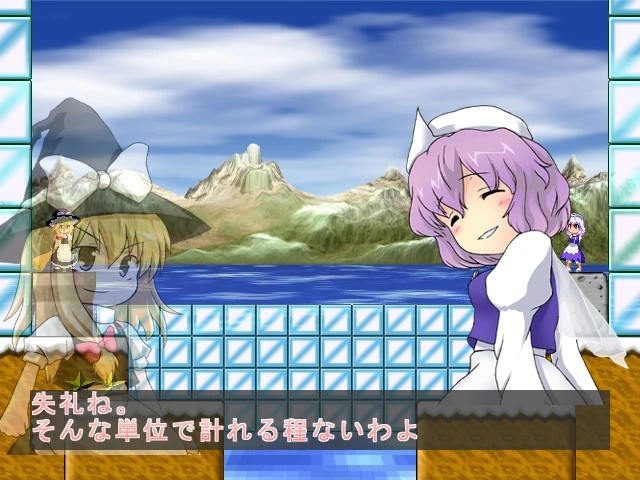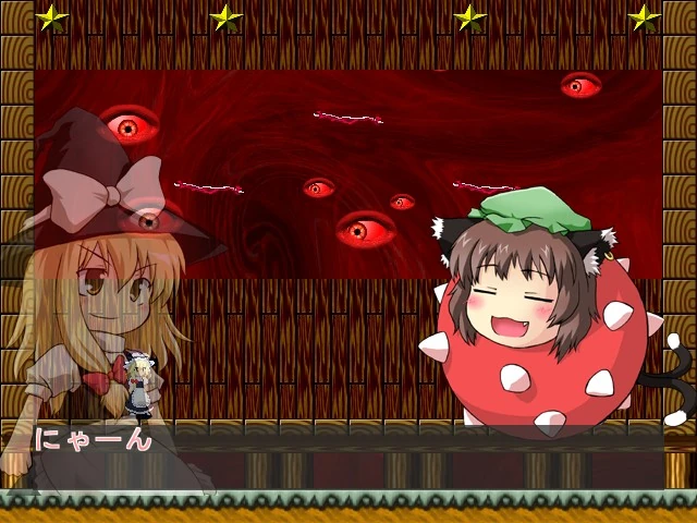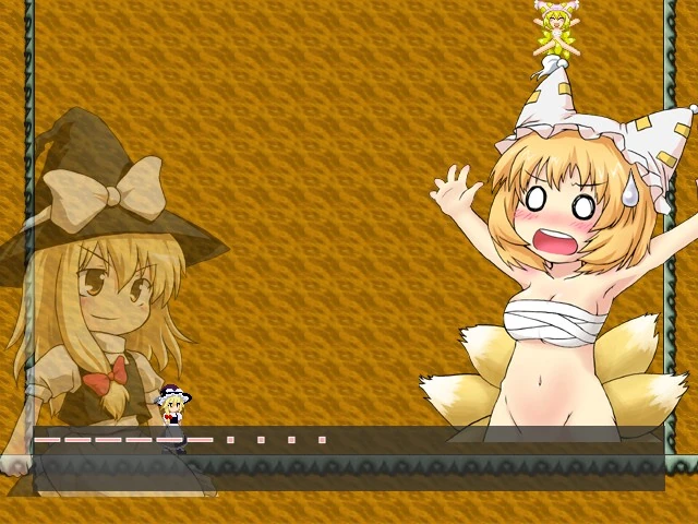After you've hit Yukari with two more fuzzies, the battle changes drastically. Yukari's gap will float down to the center of the screen and Ran and Chen will spiral out of it. Yukari is done popping out of this gap, so you can jump through as you wish. Yukari's intangibility and Ran and Chen spiraling around her may remind you of the Yukari battle from MegaMari. The rest of the battle is a six-stage imitation of Danmaku Bounded Field. Ran and Chen will start spitting out bullets: some aimed toward the middle of the screen, some shot away toward the edges of the screen. The ones shot toward the middle of the screen will stop and hover in midair. Once Ran and Chen have deployed all their bullets, they will fly toward the middle of the screen before dispersing outward. Your best bet for all the patterns is to hang around in the middle of the screen, as it is much harder to dodge the bullets from the edges of the screen. Do not forget that you can destroy bullets by drill-kicking them - doing so is crucial to survival. Also, if you get hit while you have a Miko Suit, you will destroy bullets simply by running through them while invincible (though you should be using your invincibility time to get another Miko suit if there are any left).