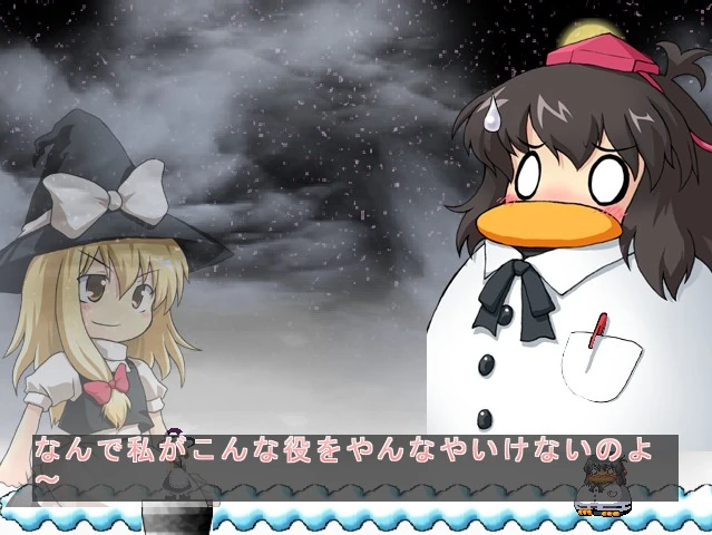 Cirno will spend the majority of the battle near the ceiling out of reach. As digestive juices drop from the ceiling (avoid them), Cirno will use Perfect Freeze to freeze them in midair. After a couple of seconds, she will dive downward, swooping across the arena to the other corner of the ceiling while the frozen juices fly towards her, at first quickly and then more slowly. Because of Cirno's movement, they may suddenly turn direction to face her again. While she's low to the ground, jump on her (hold up if you want to reach the stars on the ceiling) and she will collapse into a heap on the ground. Pick her up (with X), run under the toad's uvula, press Up and let go of X to kick Cirno at the uvula to damage the toad. The more damage done to the toad, the more juices drop down from the ceiling for Cirno to freeze. After the toad has been harassed enough, he will spit you out, ending the battle.