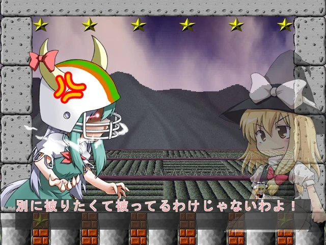 This is probably the trickiest battle in the game - if you haven't played Wrecking Crew, aren't insanely observant or incredibly lucky, you'll probably spend a long time trying to figure it out. Fortunately, once you have figured it out, it's a very fair battle. Foreman Flandre will chase you around the room with about the same intelligence as a MechaSuika (see below), but she's faster than you - and can jump - so you'll have to outmaneuver her. When she gets close to you, she will charge up her Laevatin hammer and swing it at you (the charge-up noise is the same as Sakuya's time stop charge noise), so get out of the way if you don't want to die. She will also swing her hammer if a pile of bricks gets in her way; one swing of hers will take out the entire wall section. You'll quickly find that swinging your broom back at her does not damage her, nor does jumping on her or drill kicking her (hard hat!), so you may be at a loss as to how to proceed. This is where the true Wrecking Crew aspect kicks in. See all those pipes scattered around the room, many of which are hovering in midair above discolored brick walls sections in the background? Stand under one, wait for Flandre to come to you (lure her if necessary), and bait her so that she charges up her hammer for a swing as she is under one of those pipes. Her swing will destroy the wall section, knocking the pipe down on top of her and trapping her inside, thereby damaging her. Flandre will thrash about for a few seconds and then two of her will pop out of the pipe from the top, running in opposite directions. Each of these two new Flandres will split into two more Flandres when trapped for a maximum of four possibly running around at once (a nod to Four of a Kind). Trap all four Flandres under pipes to finish the battle.