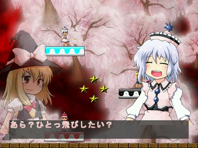 This is one of the most reasonable battles in the game because it has the most trivial solution. You can't kill Sakuya, so don't bother trying. Instead, your goal is to push the block she's chained to into the pit behind her, and all you need to do to move it is run into it. That's it. Except that's not it because she spends a lot of her time hurling knives in every direction imaginable. Unlimited Blade Words is her most prolific attack, but occasionally she'll stop time, causing every knife on the battlefield to point itself at wherever you happen to be (even ones offscreen can be affected). Sometimes, she will do this multiple times in succession, so be careful that you don't get cornered. She will also sometimes rear back behind her block for a second, lining herself up with you horizontally, before quickly charging forward along the full length of her chain to chomp whatever is in her way. Avoid this. (You can bounce off her head safely with a drill kick and her chain doesn't damage you.) Whatever she does, just keep pushing that block until it falls off the edge.