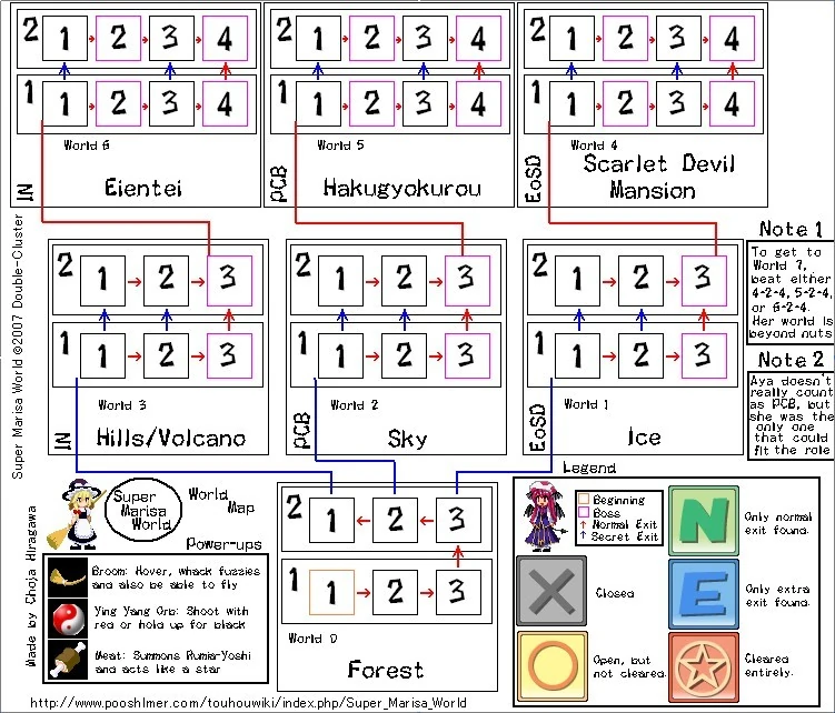 For instructions on how to find the secret exit in a given stage, see Super Marisa World: Secret Exits
