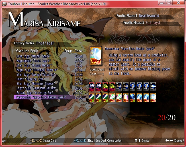 Oh, I see that there's a mismatch in the name of the SC between Marisa's Player SC and Story Mode SC. Then wouldn't it be a good idea to keep the name as it is for this page? (i.e. Use "Sure-Fire" for the Player SC and "Easy Harvest" for the Story Mode SC) It would be kinda confusing to have two different SC's share one same name. Deathsoul4 18:43, October 10, 2010 (UTC)