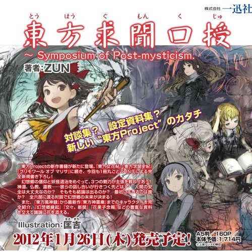 Symposium of Post-mysticism (東方求聞口授, pronounced Touhou Gumon Kuju) is an official Touhou Fanbook that was released on 27 April 2012. The book introduces every character starting from Mountain of Faith to Ten Desires. Other main information is that the three religions, Shinto, Buddhism and Taoism, will be covered. The announcement that ZUN would be releasing a new print work sometime in Winter 2011/2012 was first made by Okonogi in Nikenme Radio's sixteenth episode. ZUN personally did not say anything about it during the interview. The first available news regarding Symposium of Post-mysticism was from Touhou Project Doujin Tsuhan Jouhou website. From the announced news, the book would be... |