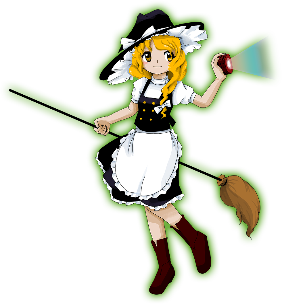 (Touhou 2) Same as Touhou 3-5, except her eyes and hair were red. Her hair was also short and straight. (Touhou 3, alternative outfit) Same as above, but her clothes are mainly white instead of purple. (Touhou 3 to 5) Same as Touhou 6-9, except her clothes were purple instead of black, there was a lot less light pink in her outfit, and she didn't have that one-sided braid. When appearing as a boss, rides what appears to be a magical vine instead of a broom. (Touhou 6 to 10.5) Same as above, except without the shawl, and the outfit is mainly black instead of navy blue. (Touhou 7.5 and 10.5, alternative outfit) Same as above, but her clothes are mainly white instead of black. (Touhou 9, alternative outfit) Same as above, but her clothes are mainly purple instead of black. (Touhou 11) Golden eyes, blond hair, a braid on only one side of her face, carries a bamboo and straw broom. Wears a navy blue witch's hat with a large pink ribbon, and a navy blue and light pink outfit with a white petticoat, and with a light blue shawl over her shoulders. (Touhou 12) Skirt is once again black, with a tan apron over it with an "M" embroidered on it. Wears a black vest over a pink shirt, hair ribbon is now white. Her hat resembles that of a cowboy more than a witch(or the point is floppy and isn't seen at the angle of her in game art). Carries a wand made of wood. (Touhou 12.5, 12.8) Golden eyes and blonde hair with a braid down her left shoulder, tied with a green ribbon. Wears a black witches' hat with a star on it, a white apron, a black skirt and a green bow. Holds a bag or purse of some sort in her left hand. (Touhou 13) Marisa has her usual attire. However, her hat's bow is purple, a purple ribbon is attached to the left side of her hair, her shoes are maroon colored with small purple ribbons on them, and a red ribbon is tied to her neck. (Touhou 13.5) Same as 10.5, except her outfit is dark blue, her shirt has a v-cut at the bottom, her hat is larger, and her hair is more golden than yellow.