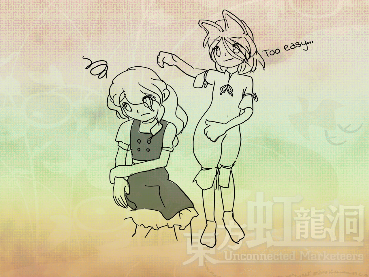 Tsukasa "Although it was just how things happened to end up, Master Iizunamaru is still worried about sending you to the berserk god, Miss Chimata that is... Think of it as aftercare!" Marisa "How fishy..." Tsukasa "Even if you are indeed a brilliant card user that enjoyed card games... Oh, to think Miss Chimata would attack you so relentlessly!" Marisa "Card games...?" Tsukasa "But I'm so glad you seem to be unharmed." Marisa "Actually, aren't you that great tengu's pet? Why'd ya go tattle on yer boss to the marketplace god?" Tsukasa "..." Marisa "You can't be too suspicious with folks whose intentions you can't guess. What is your goal anyways?" Tsukasa "I don't know if you'd believe me... But it was all for the sake of profits. I always act with the best of Master Iizunamru's financial benefit in mind. And that includes coming to check up on you, Miss Marisa!" Marisa "... Welp, that's good enough for me. Thanks for caring." Tsukasa "Heheheh, you're welcome."