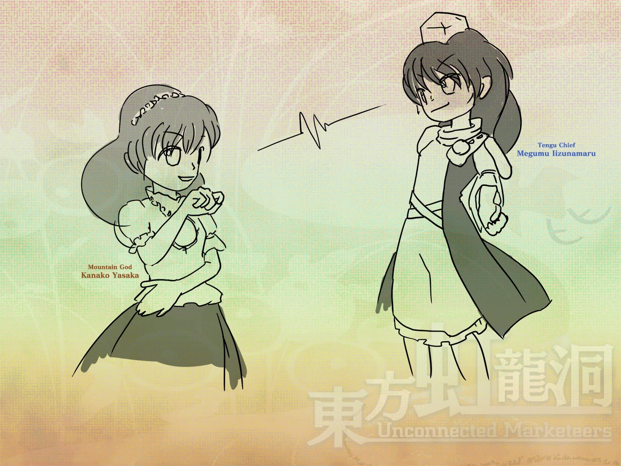 Sanae "What are those two talking about?" Tsukasa "Well, it's a business matter, isn't it?" Sanae "I have no idea what you mean." Tsukasa "Eh, that's surprising. Even though you're the maiden of that shrine." Sanae "What do you mean by..." Tsukasa "It's a well-known fact that the god here loves to jump on the bandwagon when others are profiting." Sanae "Oh, I see. I wouldn't know." Tsukasa "And if you share a little of the riches with her, she'll just sit back and overlook what you're doing. That's what Miss Iizunamaru said. Oops, that's a secret, okay?" Sanae "Hmmm." Tsukasa "Well, frankly speaking... It does help keep things peaceful around this youkai mountain. Fufufu" Kanako "This talk is over. Well then, let's go home." Sanae "Ah, yes."