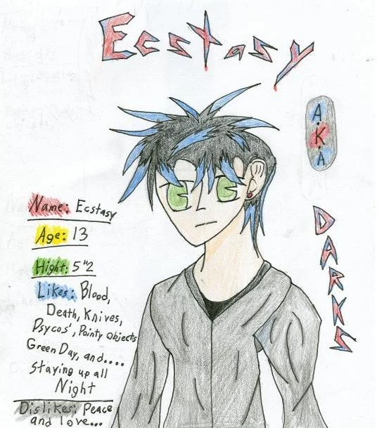 Name: Ecstasy Age: 13 Hight: 5"2 Likes: Blood, Death, Knives, Psycos', Pointy Objects, Green Day, and... Staying up all Night Dislikes: Peace and Love...