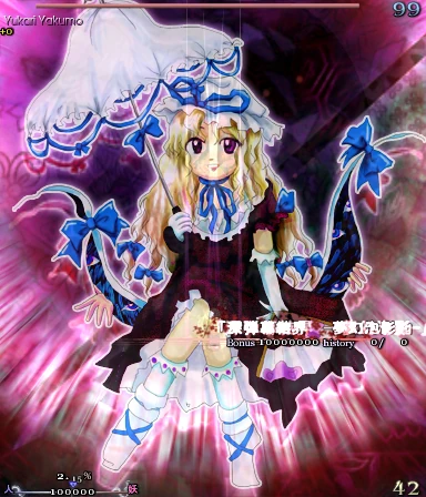 An often seen and referenced character, Yukari is the youkai of boundaries. She was first introduced in Perfect Cherry Blossom as the sleepy mistress of Ran. During Imperishable Night Yukari teams up with Reimu to find those responsible for the fake moon. In Immaterial and Missing Power she actually sings her way from battle to battle stealing everyone's sake, wine, and brandy. Even right from the shrine's altar... however, this is all part of her strategy to save the day. Somehow.